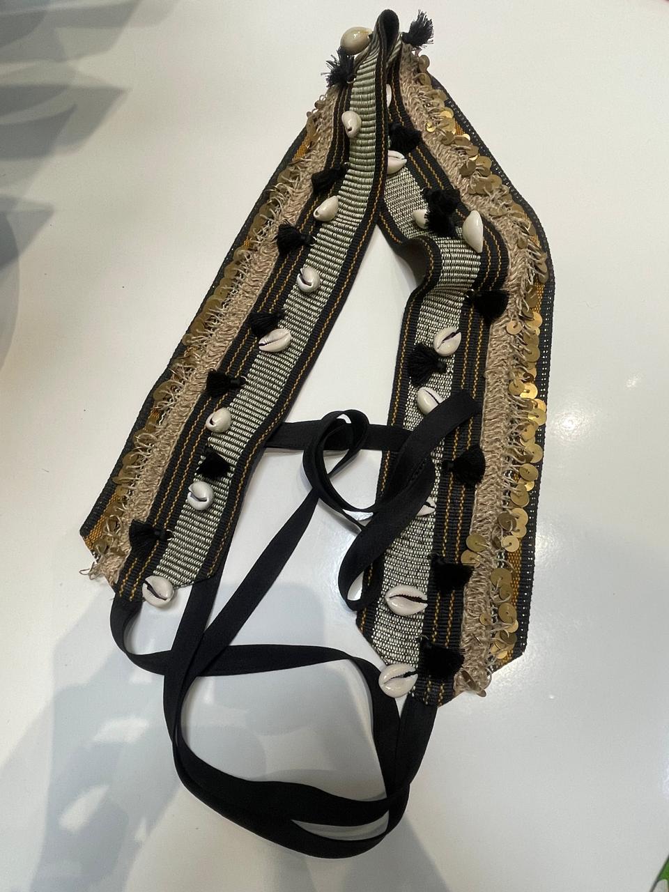 The Cowrie Belt is a striking statement accessory that blends natural and metallic elements. This adjustable belt features a wide, structured band decorated with natural cowrie shells, black tassels, and glistening gold sequins. Secured with black elastic ties, this piece is perfect for cinching a flowing dress or adding an artisanal, bohemian touch to any outfit.