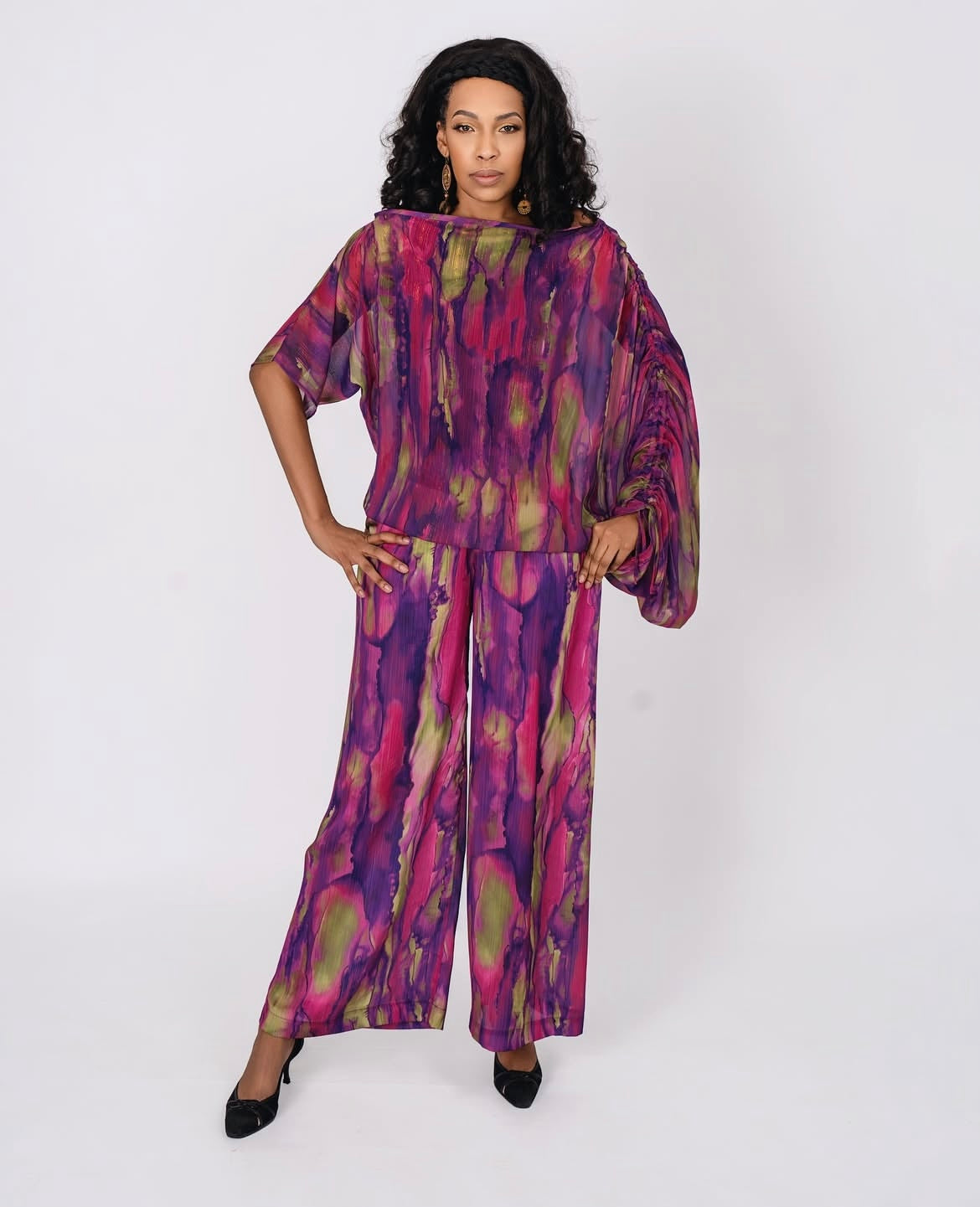 The Amethyst Set is a mesmerizing, fluid ensemble that balances artistic expression with a relaxed, modern silhouette. This two-piece set features a boat-neck top with a unique asymmetrical sleeve design—one side short and airy, while the other features dramatic, gathered rouching that creates a beautiful draped effect. Paired with high-waisted, wide-leg trousers, the entire set is covered in a lush, abstract print of deep violets, magentas, and mossy greens, making it a sophisticated yet comfortable choice for a gallery opening or an elegant garden party.