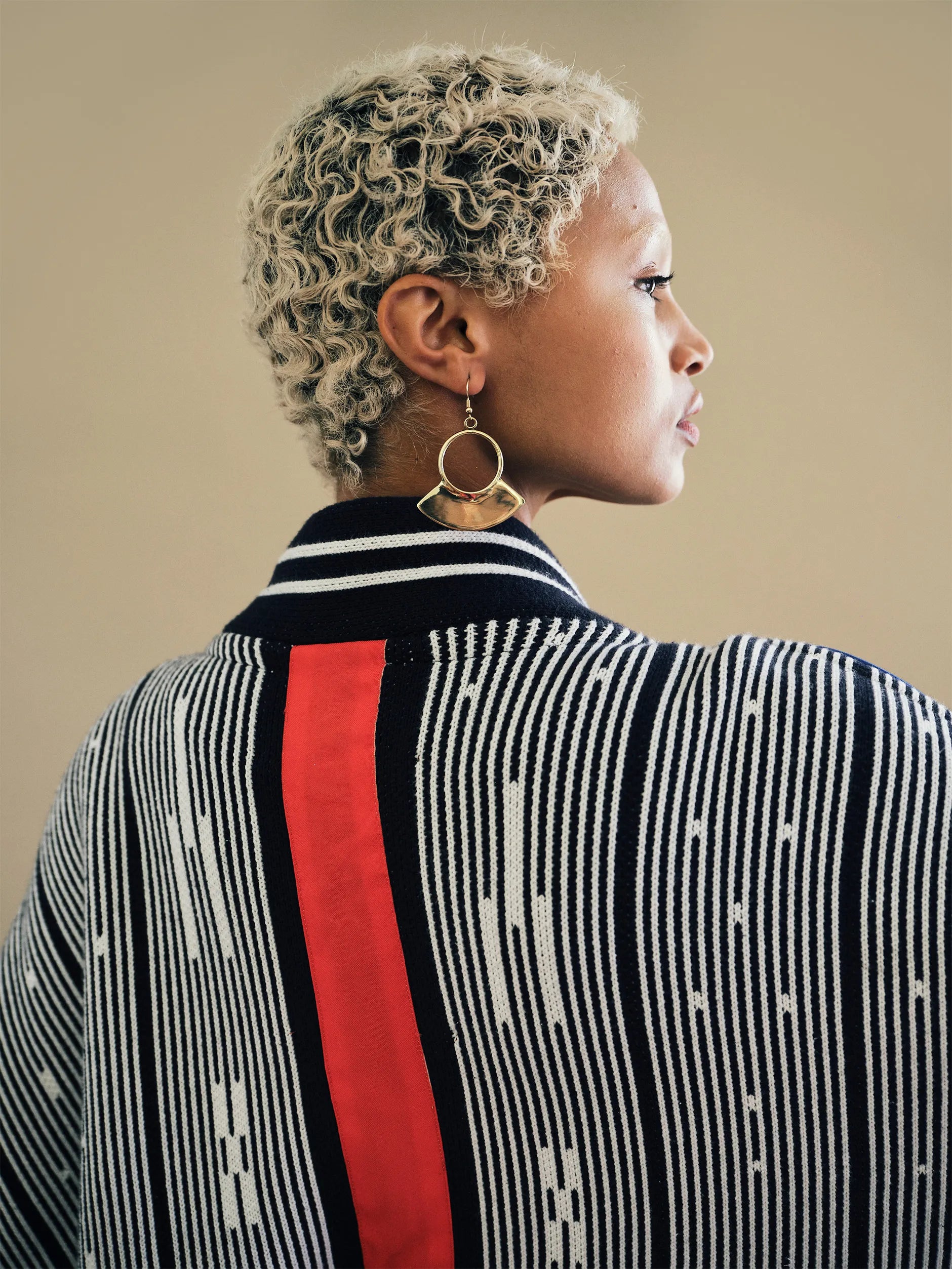 This stunning Baule Coat is a limited edition. It's a long, flowing coat with a cool, abstract pattern in shades of blue-grey and off-white. This piece makes a bold statement, blending traditional African art with modern style for a truly unique look.