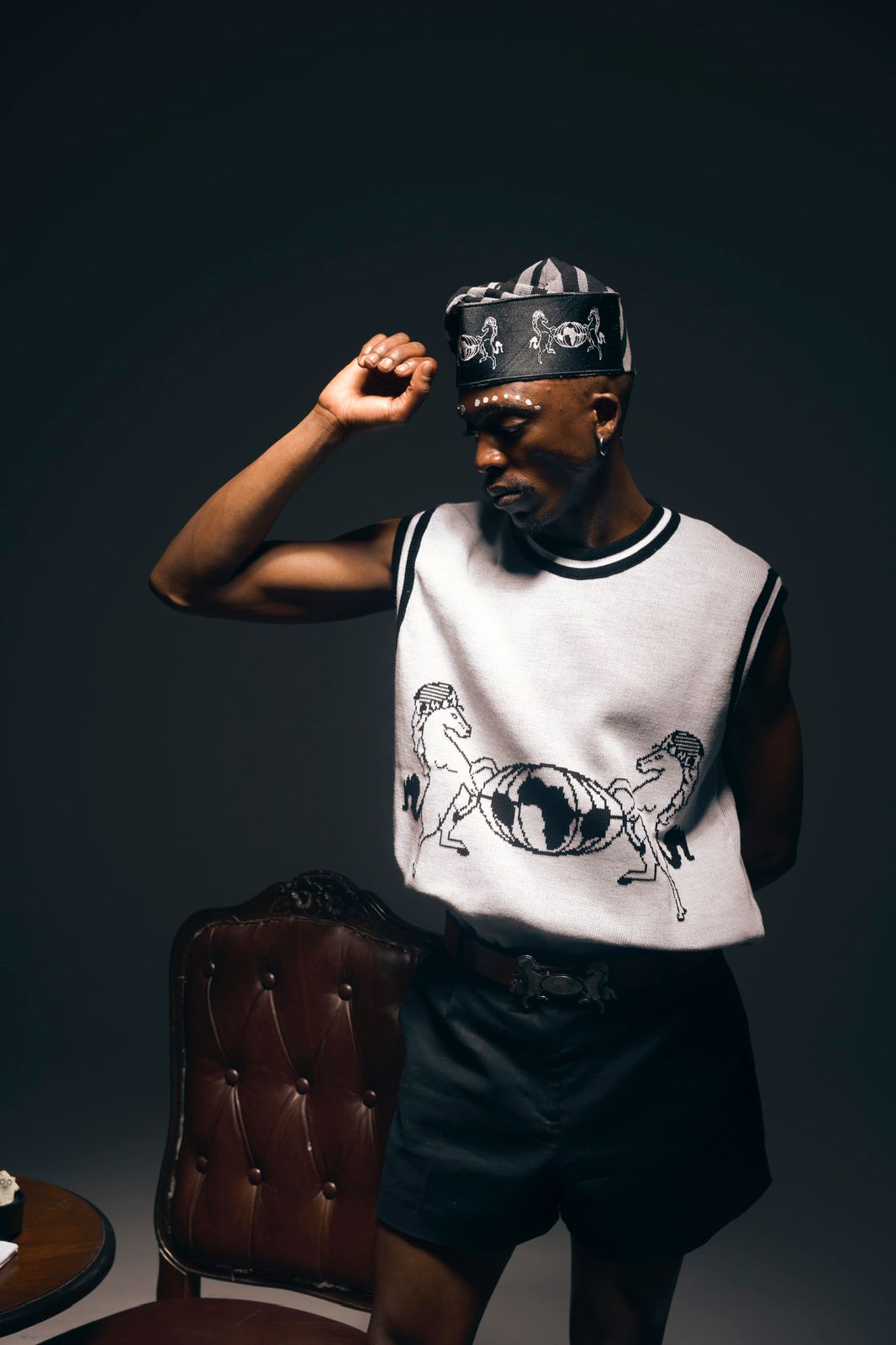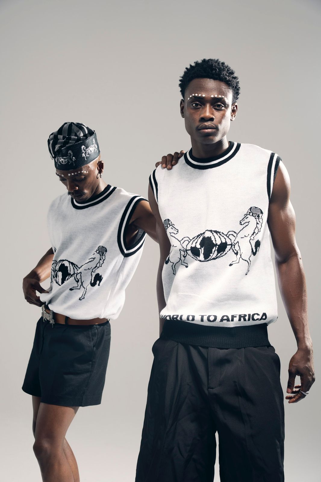 Knitted in Johannesburg, this sleeveless piece features a striking jacquard design inspired by the Nigerian coat of arms: two regal horses flank a globe-like African symbol, symbolizing strength, unity, and cultural exchange. The phrase “World to Africa” anchors the design, echoing the collaboration’s mission of reconnecting global influence to the African continent.