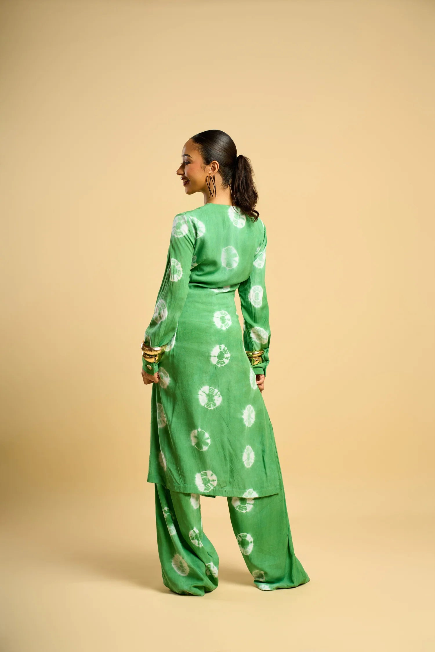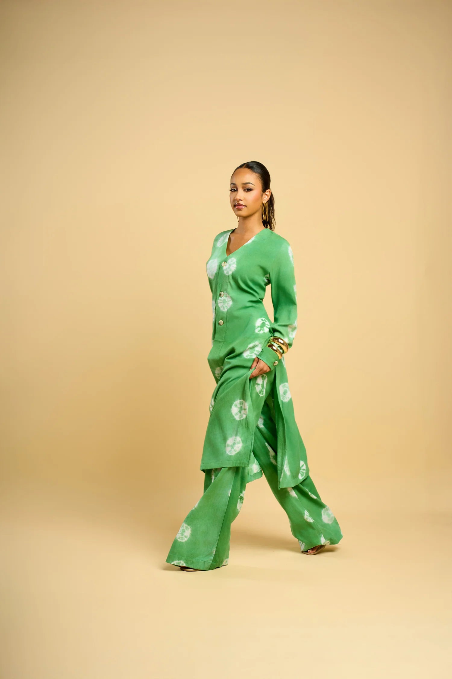 Ensemble Binette Embrace fresh, playful elegance with the Ensemble Binette. This two-piece set features a long, stylish top with a V-neck and a button-down front, paired with matching wide-leg pants. The vibrant green fabric is adorned with a unique white circular pattern, offering a comfortable yet chic look that is perfect for both casual outings and stylish events.