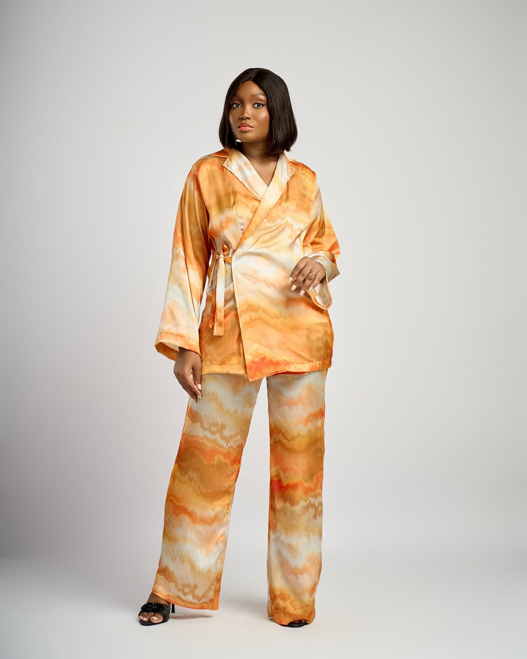 Make a vibrant impression with the Ensemble Myriam. This two-piece set features a rich orange and white abstract tie-dye print with a silky, fluid feel. The top has a flattering wrap design with a self-tie belt and long, flowing sleeves, paired perfectly with comfortable wide-leg pants. It’s an effortlessly chic ensemble that blends comfort with bold, artistic style.