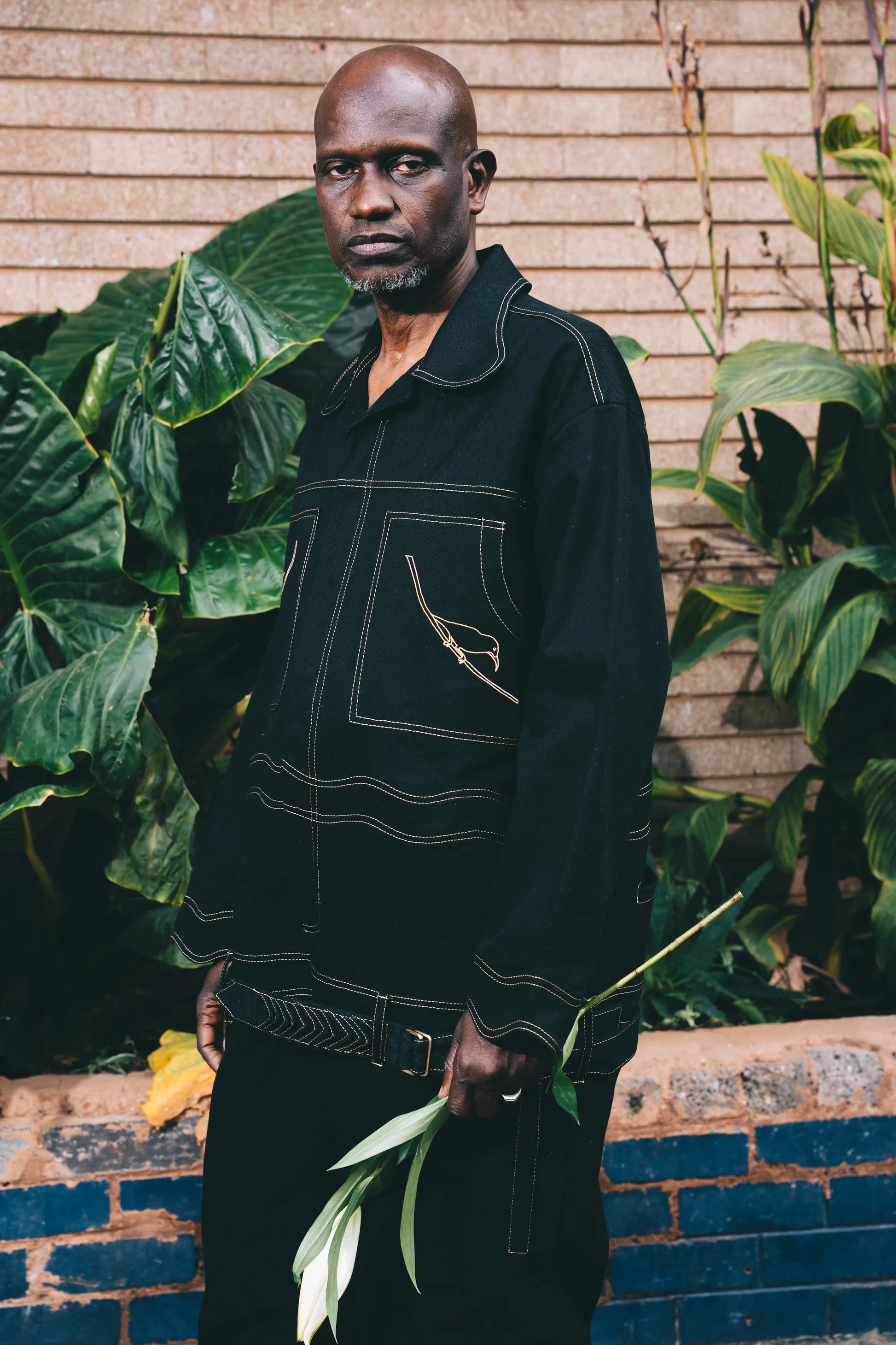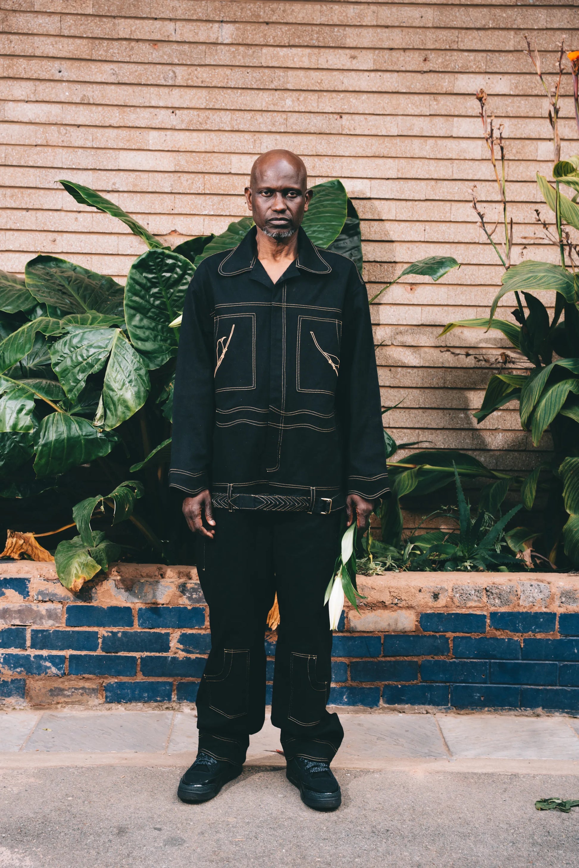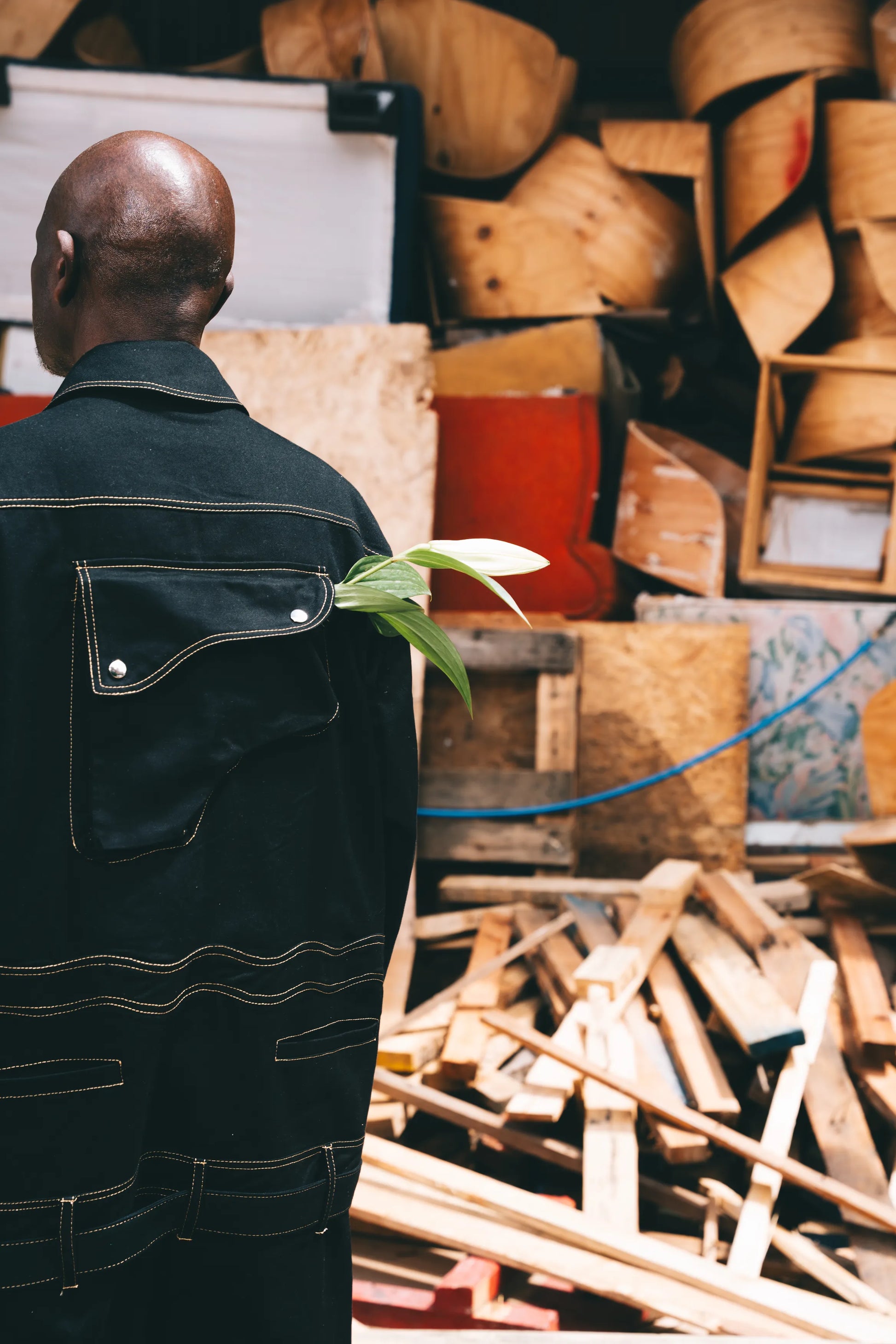 A structured overall jumpsuit designed with an emphasis on detail and function. Finished with a wavy hem feature and multiple utility pockets, the piece is accented with an embroidered bird outline and a detachable belt inspired by tyre tracks, referencing movement and journey within the Into the Garden narrative.