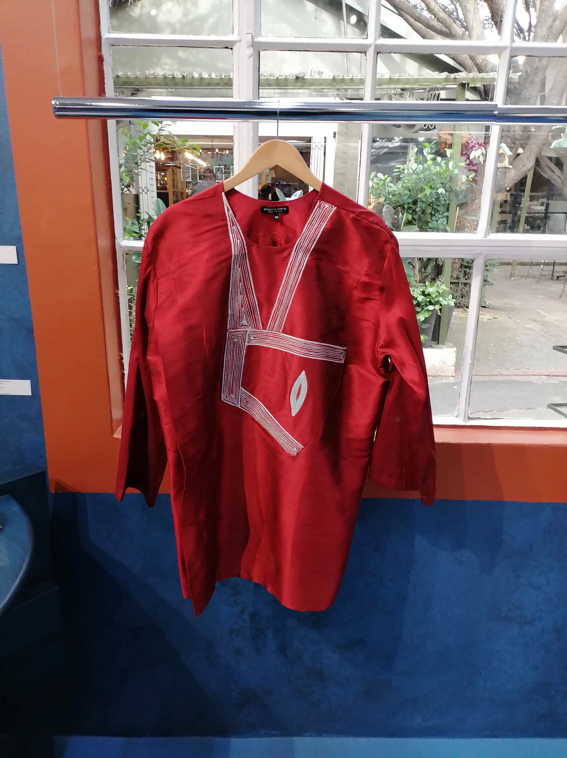 A refined and elegant short tunic featuring a deep ruby-red hue with intricate white embroidery. The asymmetrical neckline detailing adds a modern touch to its traditional inspiration, while the long sleeves provide a sophisticated look. Perfect for both casual and formal settings, this piece blends cultural artistry with contemporary fashion.