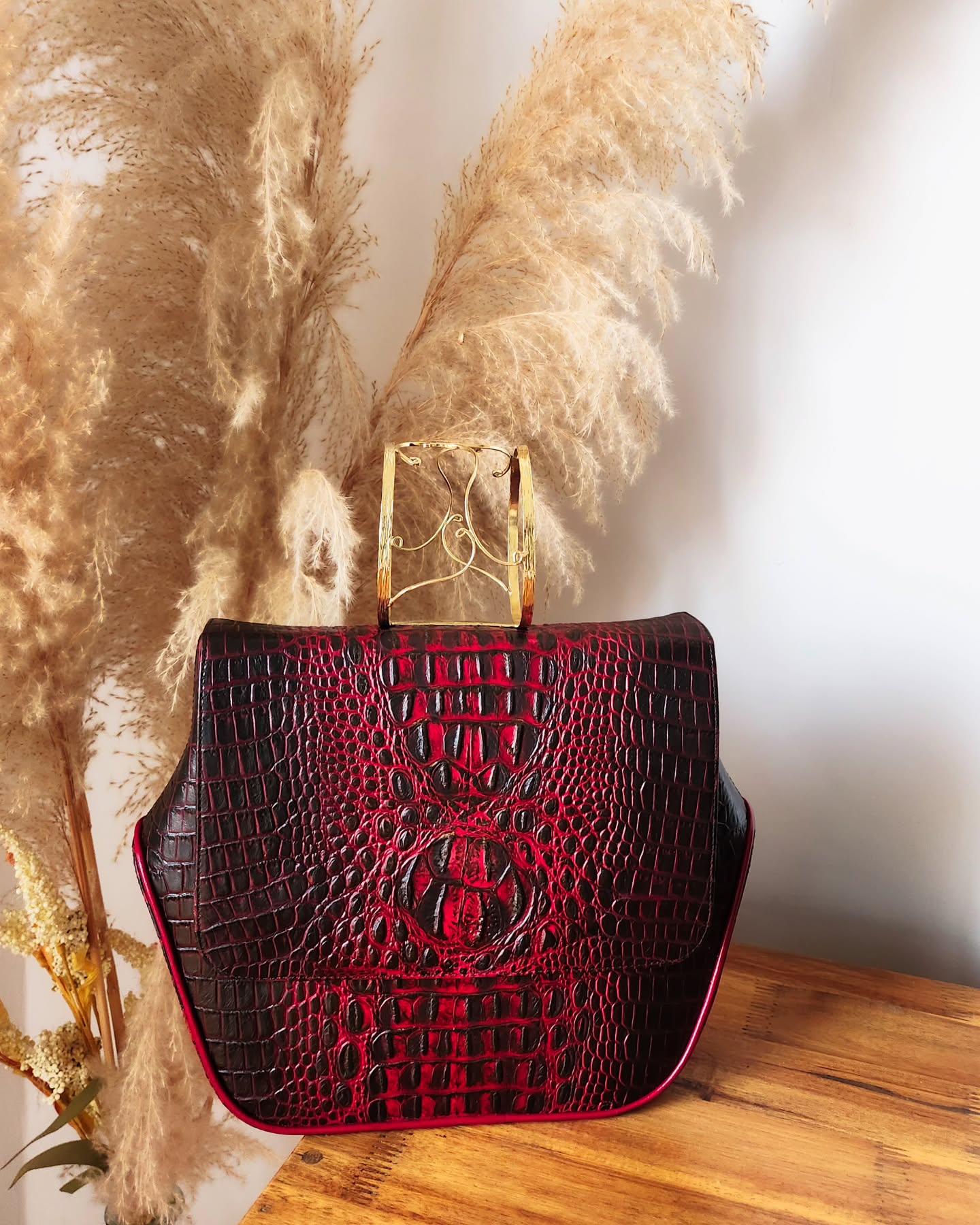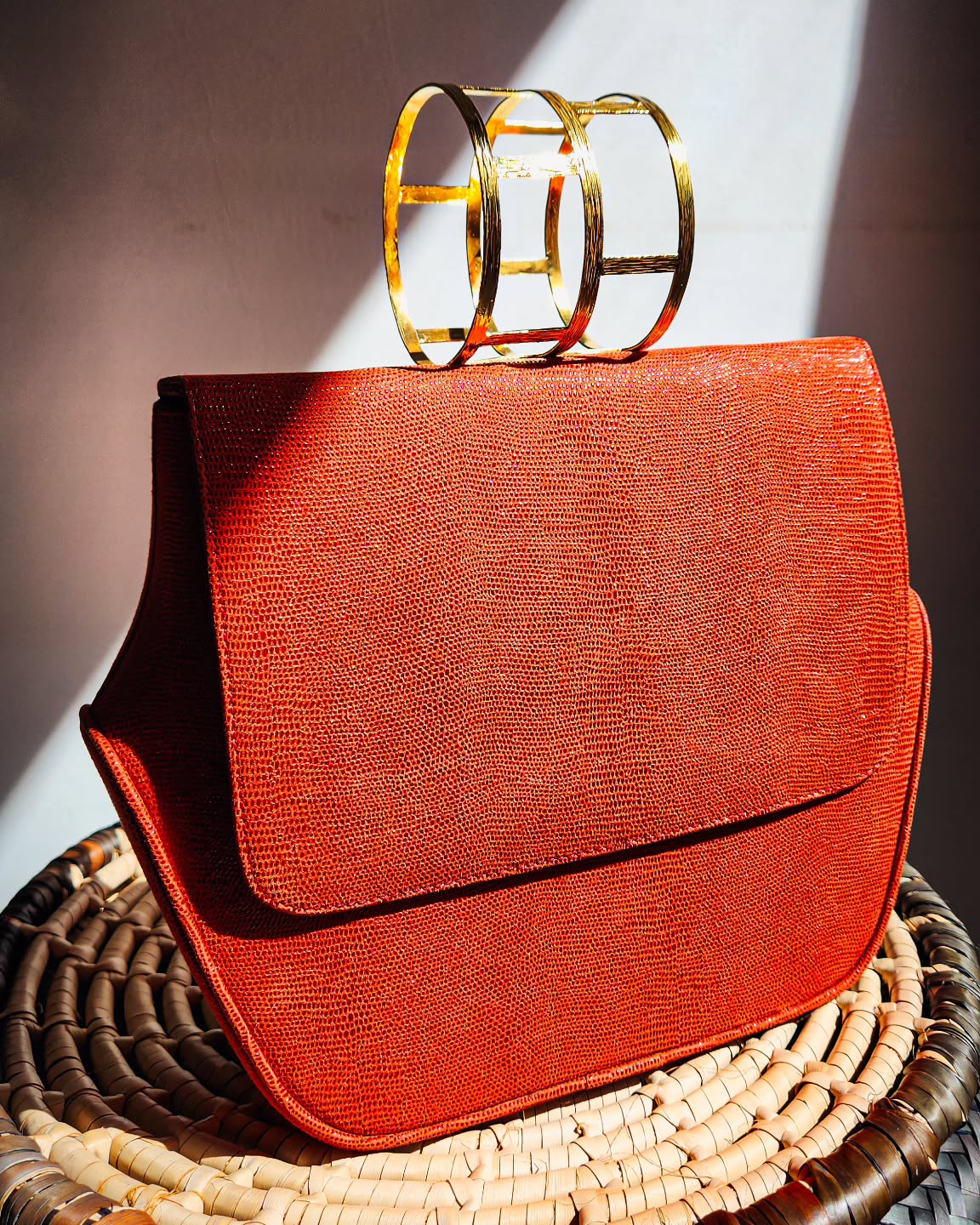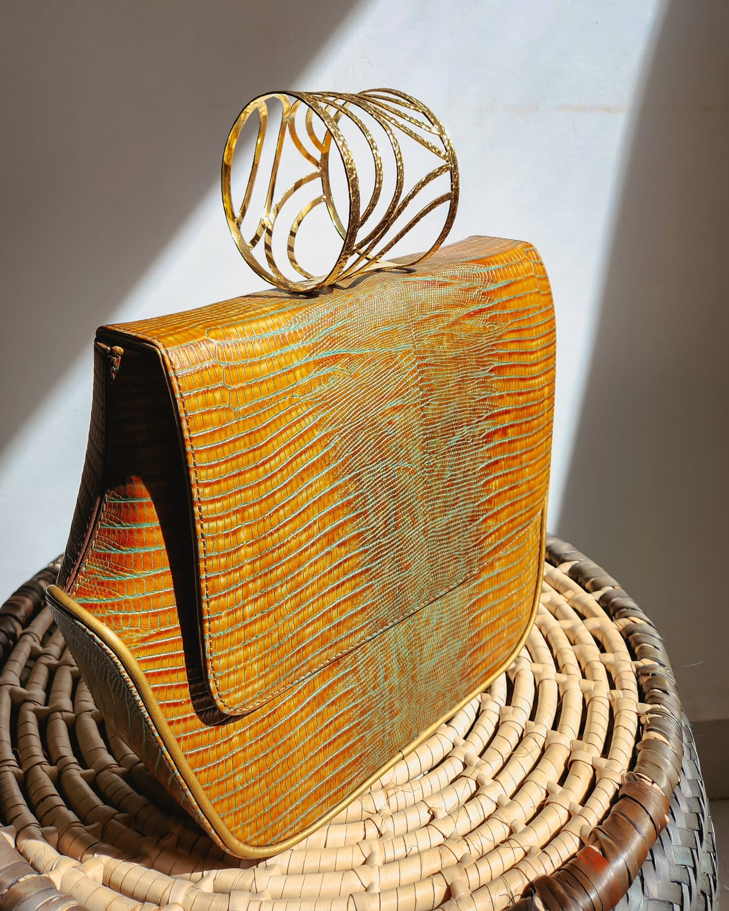 The Wuna Bag is a handcrafted leather clutch featuring a distinctive gold-dipped bracelet handle. Made from premium Mexican leather and finished by Senegalese artisans, it combines global craftsmanship with refined elegance. Available in rich colors and textures—from woven to embossed—this versatile piece transitions seamlessly from day to evening.